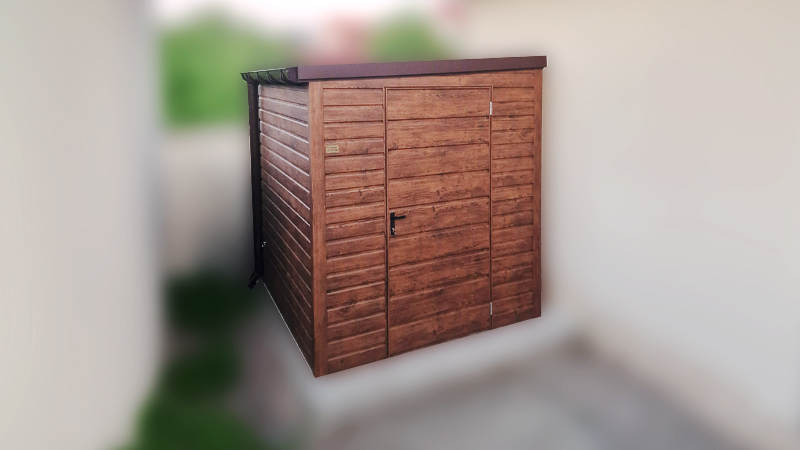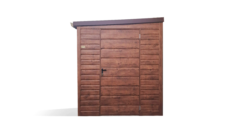 2x2m-es delux fém kerti tároló balra lejtő tetővel, sötét diófa falakkal, ereszcsatornával, szegélyekkel, horganyzott vázszerkezettel, vízszintes lemezborítással