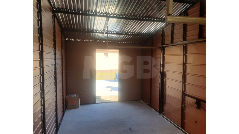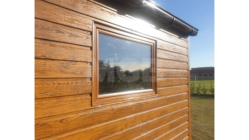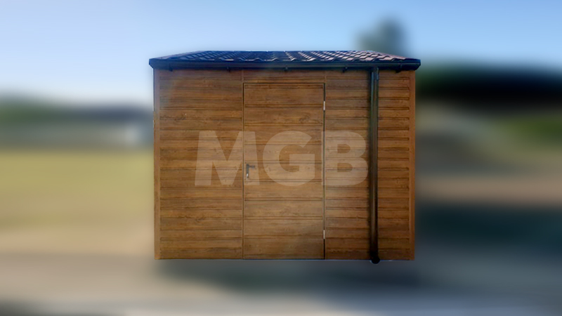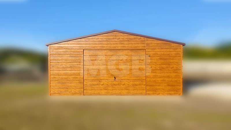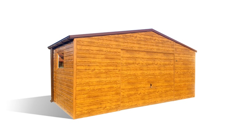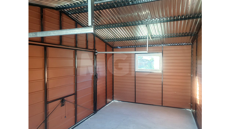 6x3m-es delux tároló nyeregtetővel, csokoládébarna cserepeslemez tetővel, világos aranytölgy falakkal, billenőkapuval és ajtóval, ablakkal, ereszcsatornával, szegélyekkel, horganyzott vázszerkezettel, vízszintes lemezborítással