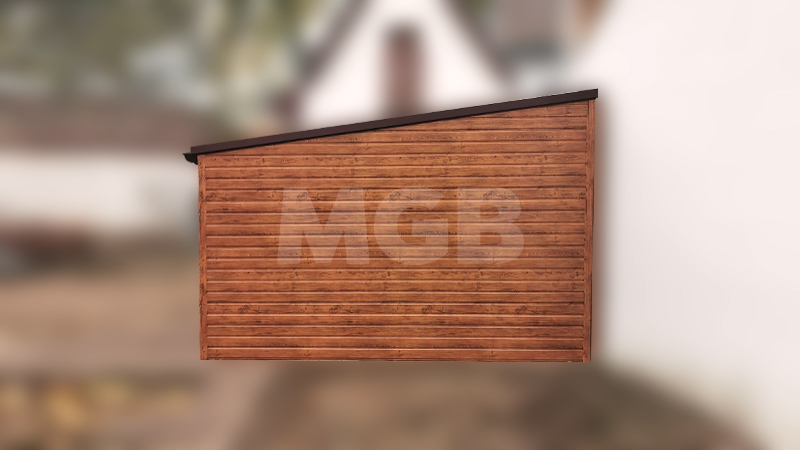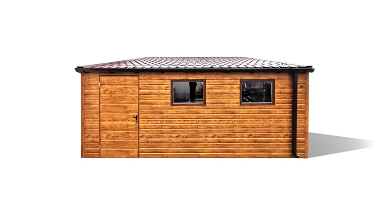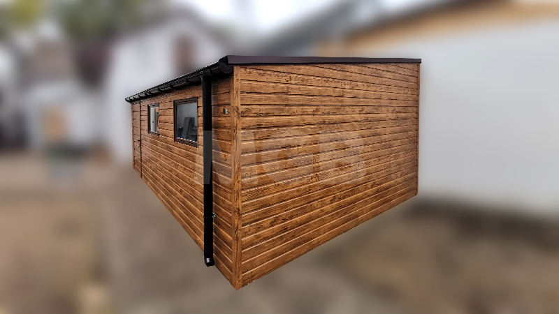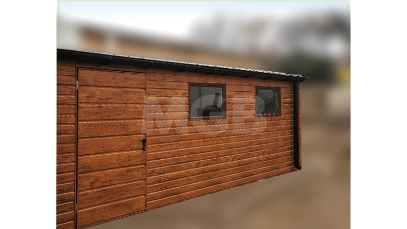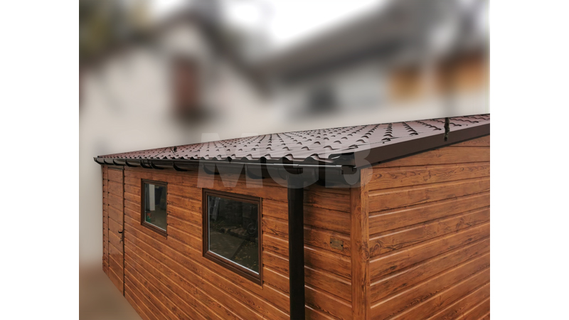 6x4m-es delux tároló előre lejtő tetővel, csokoládébarna cserepeslemez tetővel, világos aranytölgy falakkal és ajtóval, 2db ablakkal, ereszcsatornával, szegélyekkel, horganyzott vázszerkezettel, vízszintes lemezborítással