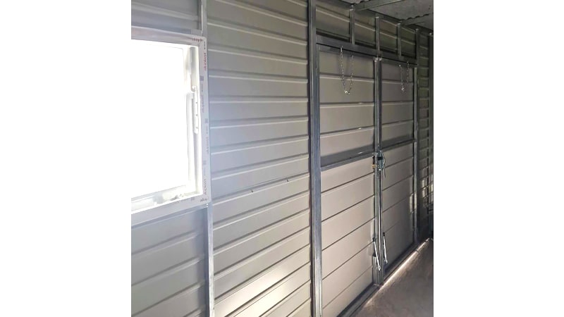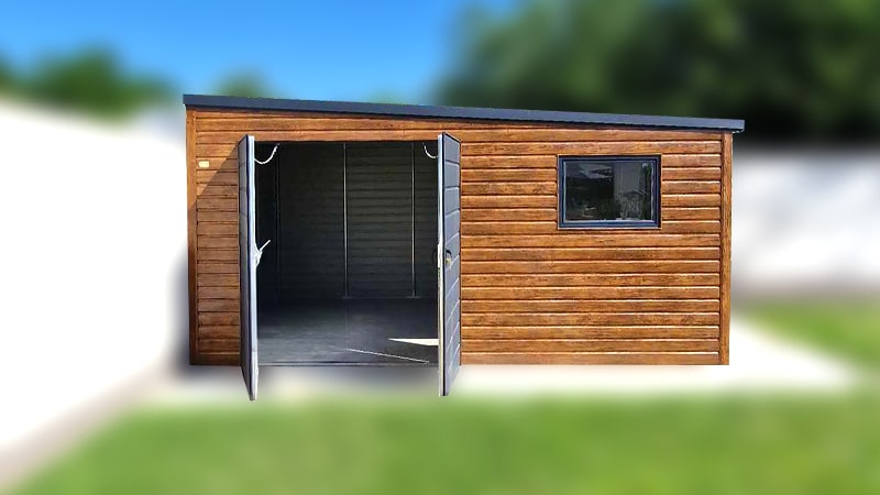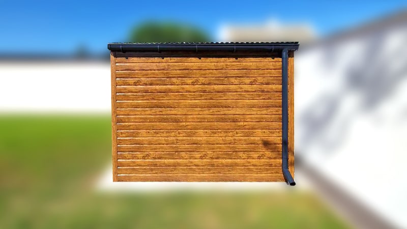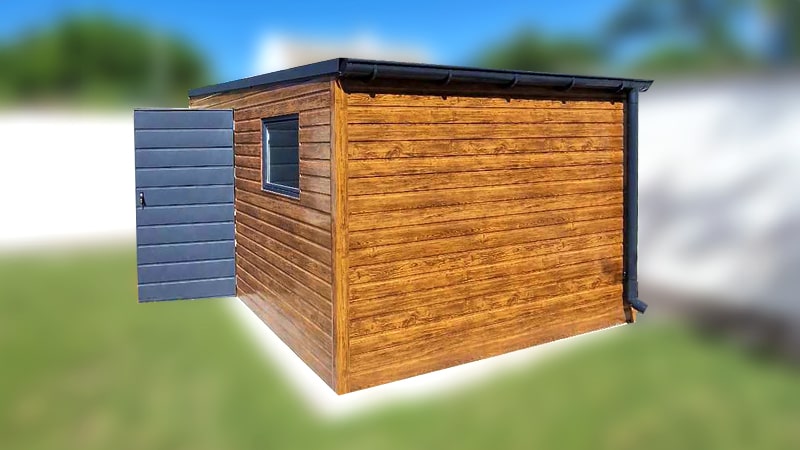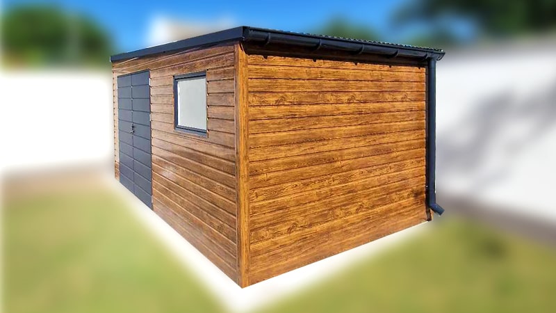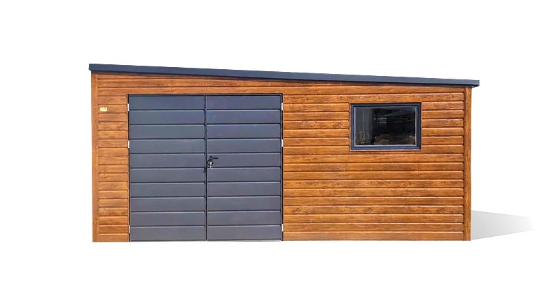 5x3m-es delux tároló jobbra lejtő tetővel, világos aranytölgy falakkal, matt antracitszürke kapuval, ablakkal, ereszcsatornával, szegélyekkel, horganyzott vázszerkezettel, vízszintes lemezborítással