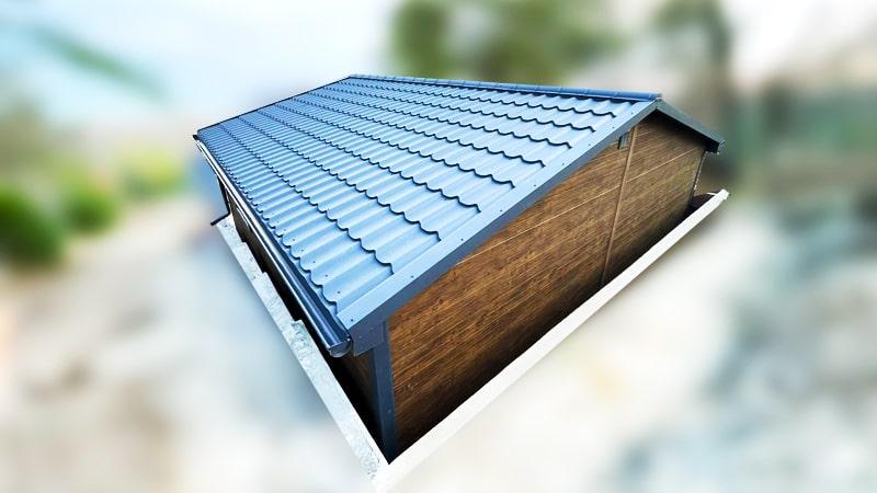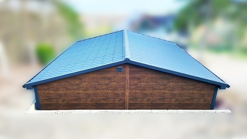 6×5,8m-es delux szigetelt mobilgarázs nyeregtetővel, sötét diófa falakkal, antracitszürke szekcionált kapuval és ajtóval, ablakkal, 2db szellőzőráccsal, szegélyekkel, ereszcsatornával, fekete cserepeslemez tetőborítással