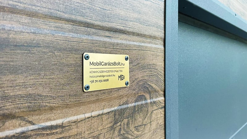• Színek: sötét diófa (falak), fényes antracitszürke RAL7016 (kapu, ajtó, tető, ablak, sarok és tetőszegély)