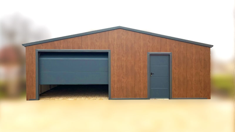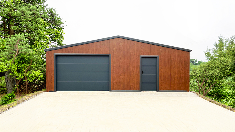 • 8x6m-es delux szigetelt mobilgarázs, sötét diófa falakkal, nyeregtetővel, antracitszürke szekcionált kapuval és ajtóval, szegélyekkel, ereszcsatonával, horganyzott vázszerkezettel