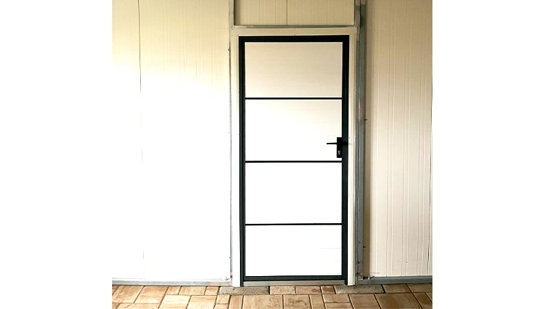 • Ajtó típusa: 1db ajtó (jobbos, 0,9x2m, szigetelt, alumínium kerettel, széles vízszintes panel borítással) az elülső falon, 1,8m-re a jobb oldalfaltól