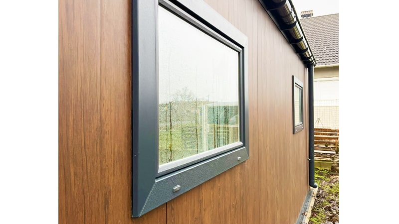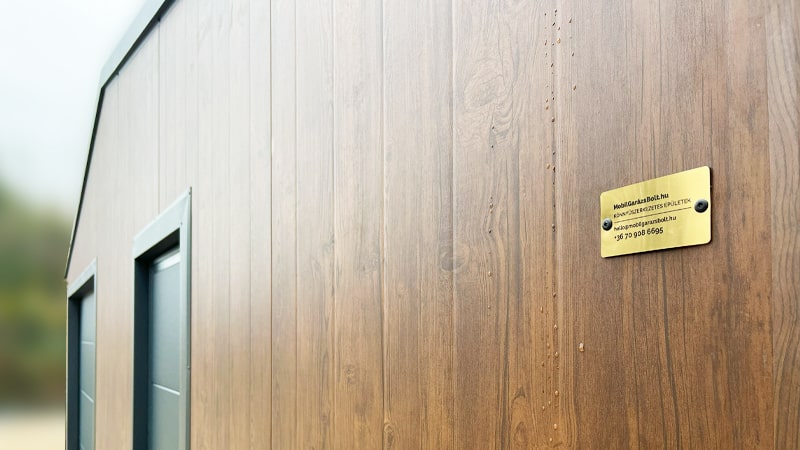 • Színek: sötét diófa (falak), fényes antracitszürke RAL7016 (kapu, ajtó, tető)