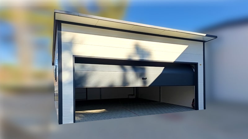 • 6x6m-es DELUX szigetelt mobilgarázs, hátra lejtő tetővel, fehér falakkal, antracitszürke szekcionált kapuval és ajtóval, szegélyekkel, ereszcsatonával, horganyzott vázszerkezettel