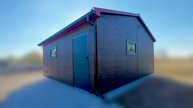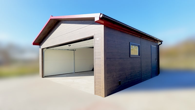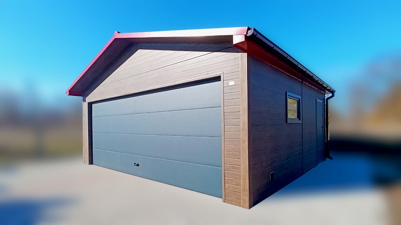 • 6x5,8m-es DELUX szigetelt mobilgarázs, nyeregtetővel, sötét diófa falakkal, antracitszürke szekcionált kapuval és ajtóval, szegélyekkel, ereszcsatonával, horganyzott vázszerkezettel
