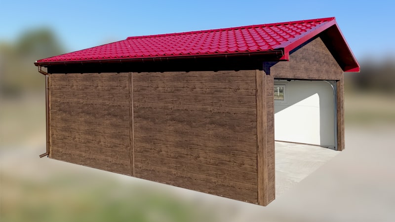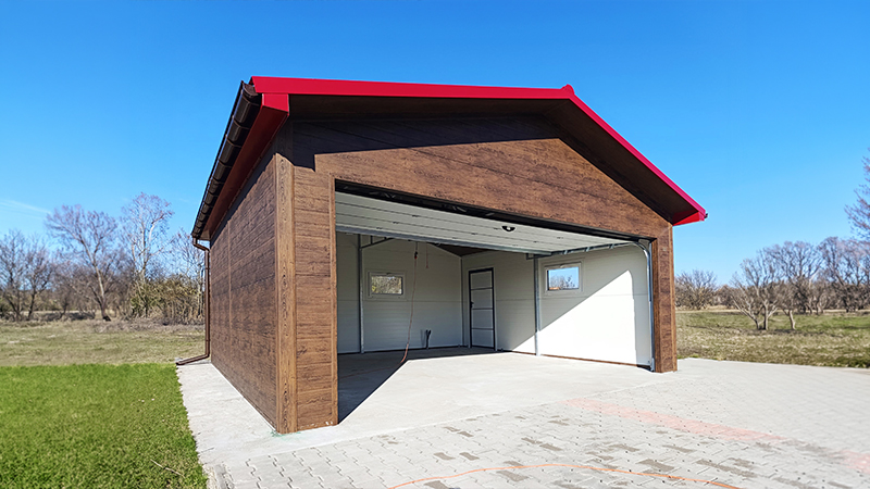 • Színek: sötét dió (falak), fényes antracitszürke (kapu, ajtó), fényes meggypiros RAL3011 (tető)